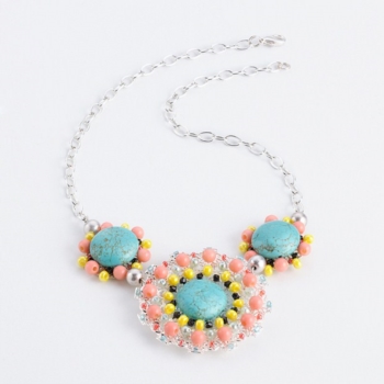 Girocollo Turchese Girocollo realizzato con catena in alluminio, prezioso pendente ricamato a mano con pietre di Turchese e perle in vetro. Materiale: catena in alluminio, base metallica, pietra di Turchese,perle in vetro. Questi pendenti possono essere realizzati nei colori da voi preferiti e le basi su cui avviene il ricamo possono avere forme diverse ( cuori, farfalle, fiori ecc ) P.S. per permettermi di realizzare al meglio questo gioiello utilizzate l'e-mail di conferma prodotto segnalando le vostre richieste, vi contatterò al più presto per esporvi le mie proposte. Codice Prodotto: CPC007 Prezzo: € 28,00 TORNA ALL'ELENCO